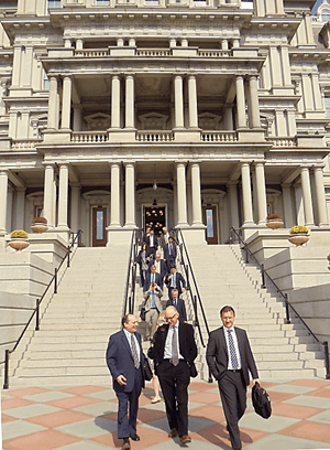 Anari Worldview Group leaving a meeting at the White House Old Executive Office Building including (center front) Anatole Kaletsky, co-founder of Gavekal, one of the world’s leading independent providers of global investment research
